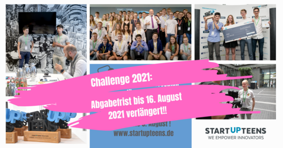 Die Abgabefrist für den diesjährigen Businessplan-Wettbewerb verlängert sich vom 5. auf den 16. August 2021. Grund sind die Anfragen von Challenge-Teilnehmenden aus Rheinland-Pfalz und Nordrhein-Westfalen, die von den Auswirkungen der Flutwelle betroffen sind. Dem Wunsch nach Verlängerung kommt STARTUP TEENS selbstverständlich nach.