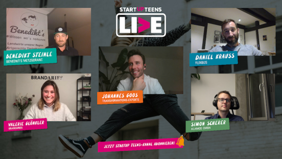 In unseren interaktiven, digitalen Events blicken erfolgreiche Gründer*innen , Familienunternehmer*innen oder unternehmerisch denkende Angestellte auf die Arbeitswelt von morgen. Dazu gibt es jede Menge Best‑Practice‑Beispiele und vor allem viel Zeit für deine Fragen. Den gestrige STARTUP TEENS-Talk hat der Landkreis Dillingen nach Bayern geholt!