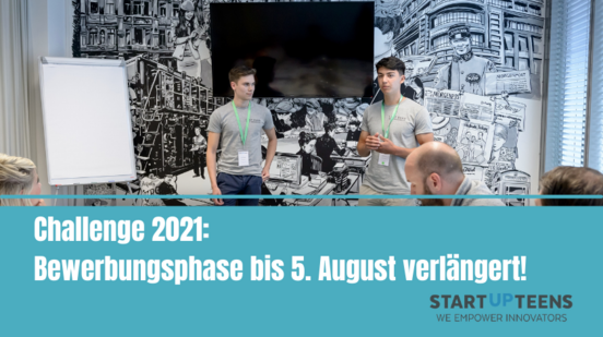 Wichtig: Die Altersbeschränkung bei der STARTUP TEENS Challenge bezieht sich weiter auf das ursprüngliche Abgabedatum. Um einen fairen Wettbewerb zu gewährleisten und Wettbewerbsverzerrungen auszuschließen, sind Teilnehmer*innen, die bis zur ursprünglichen Abgabefrist am 6. Mai 2021 14 bis 19 Jahre alt waren und eine Schule in Deutschland besuchten, teilnahmeberechtigt, obwohl die Bewerbungsfrist verlängert wurde.